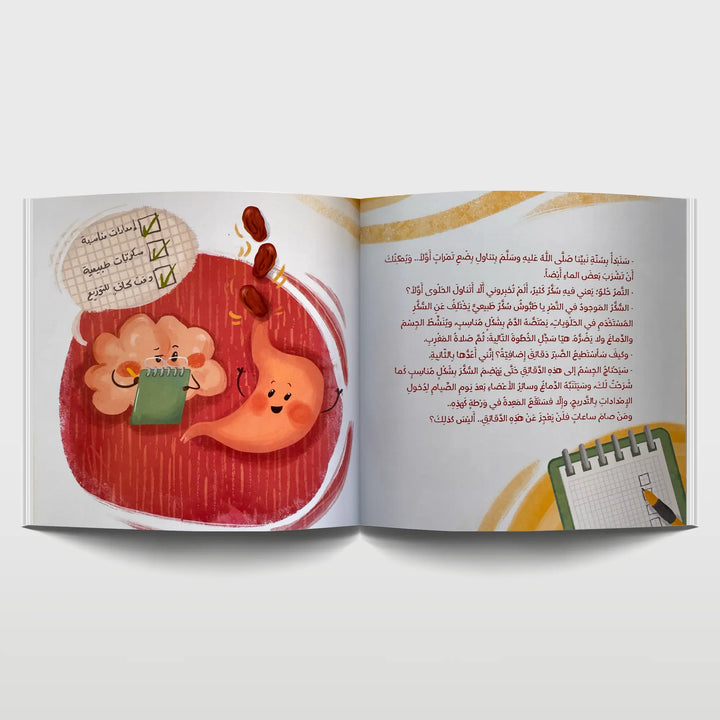 وتقدم القصة شرحاً مبسطاً عما يحدث عند تناول الطعام داخل المعدة، ثم تشرح برسومات طريفة عن الرسائل المتبادلة بين الدماغ والمعدة. كما تشير إلى أهمية التوازن في الأكل بين السكريات الطبيعية والألياف والنشويات والبروتين والدهون، وهي أمور هامة توجه إليها القصة لتشجيع الأطفال على تناول الطعام بشكل صحي ومتوازن خلال شهر رمضان وبعده.